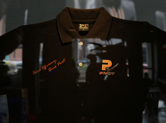 ขณะที่บริเวณหน้าอกด้านขวาปักคำว่า “Think Efficiency Think Pivot”