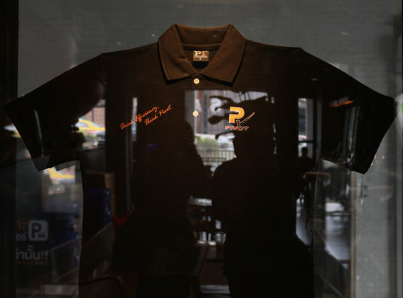 เสื้อโปโลสีดำซึ่งโดดเด่น ด้วยโลโก้ไพวอทฯ สีส้มขอบขาวบริเวณหน้าอกด้านซ้าย